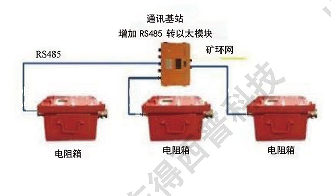 当电阻箱距离变电所超过1000m而就近具备通讯基站时,可将RS485总线接入通讯基站,基站中增加RS485转以太网模块实现网络接入(转换模块取基站12V~48V工作电源)。